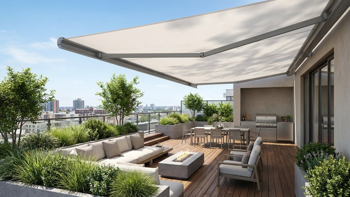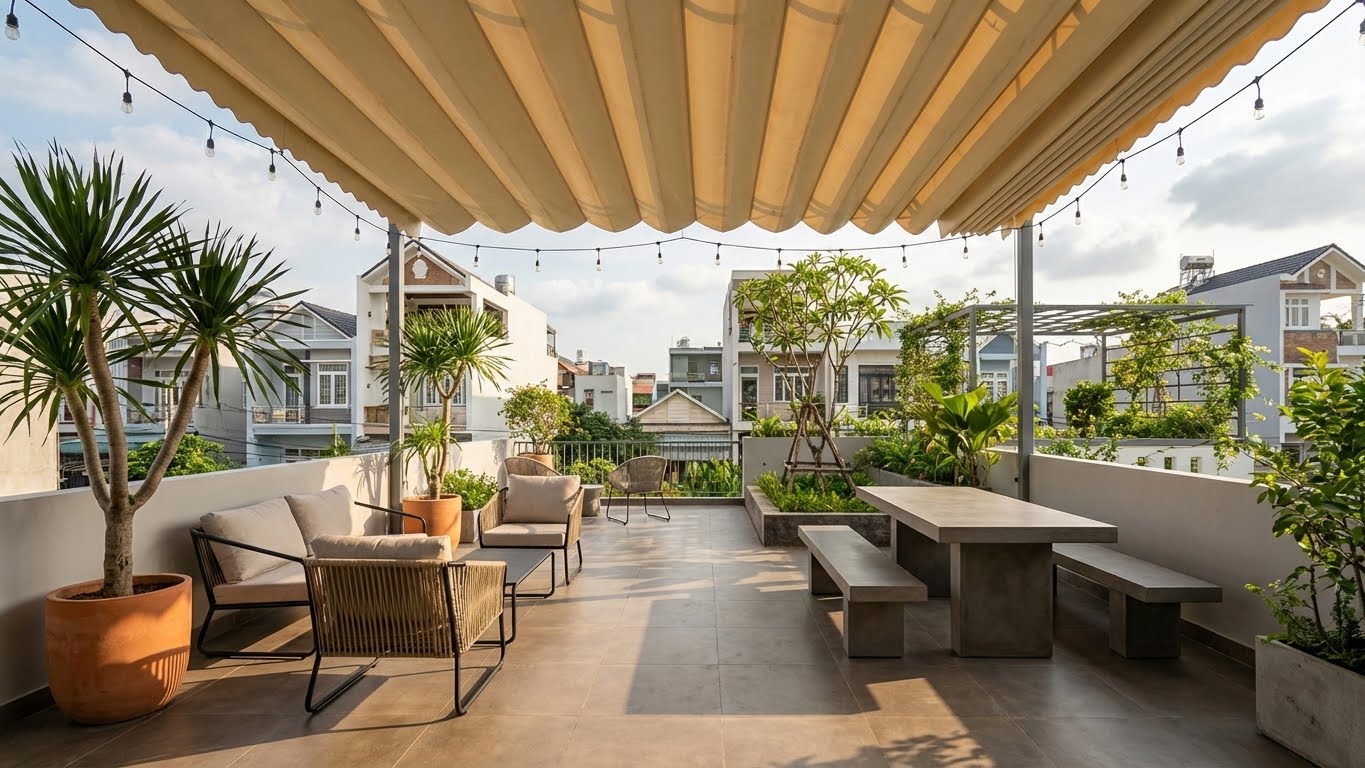 Sân thượng thường bị bỏ phí vì nắng nóng và mưa tạt. Lắp đặt một hệ thống mái che không chỉ bảo vệ ngôi nhà mà còn mở rộng không gian sống.