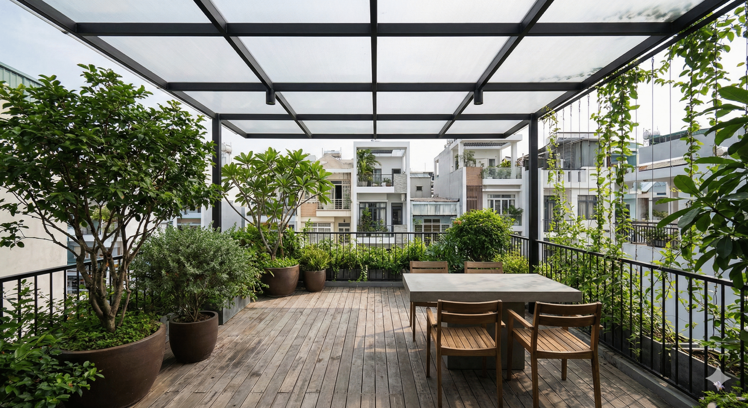 Không chỉ đơn thuần là một tấm lá chắn bảo vệ, mái che sân thượng hiện đại còn là một yếu tố thẩm mỹ quan trọng, giúp biến đổi không gian ngoài trời bị lãng quên thành một khu vực chức năng đầy tiện ích: từ phòng khách xanh, vườn nướng BBQ, đến khu vực thư giãn, đọc sách...